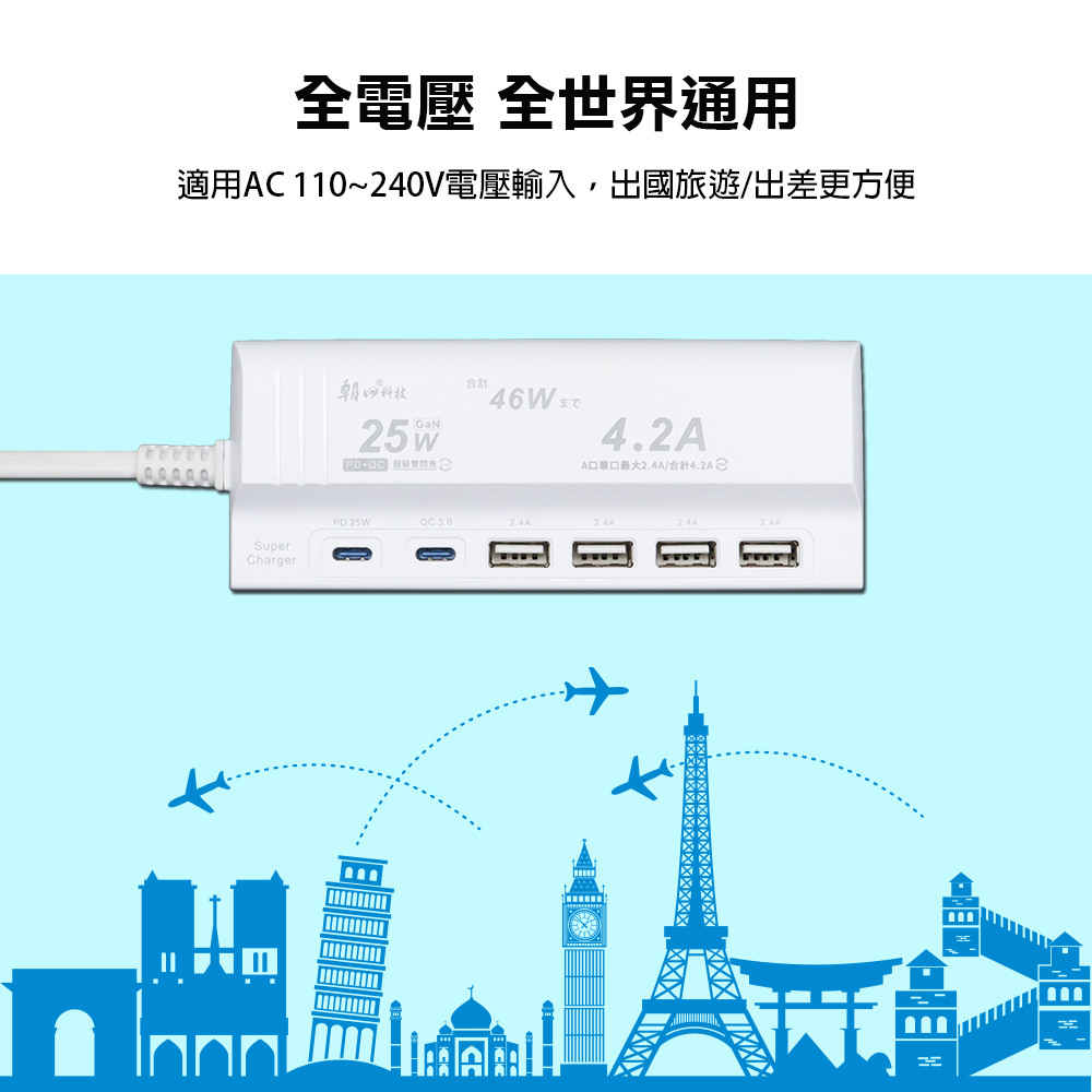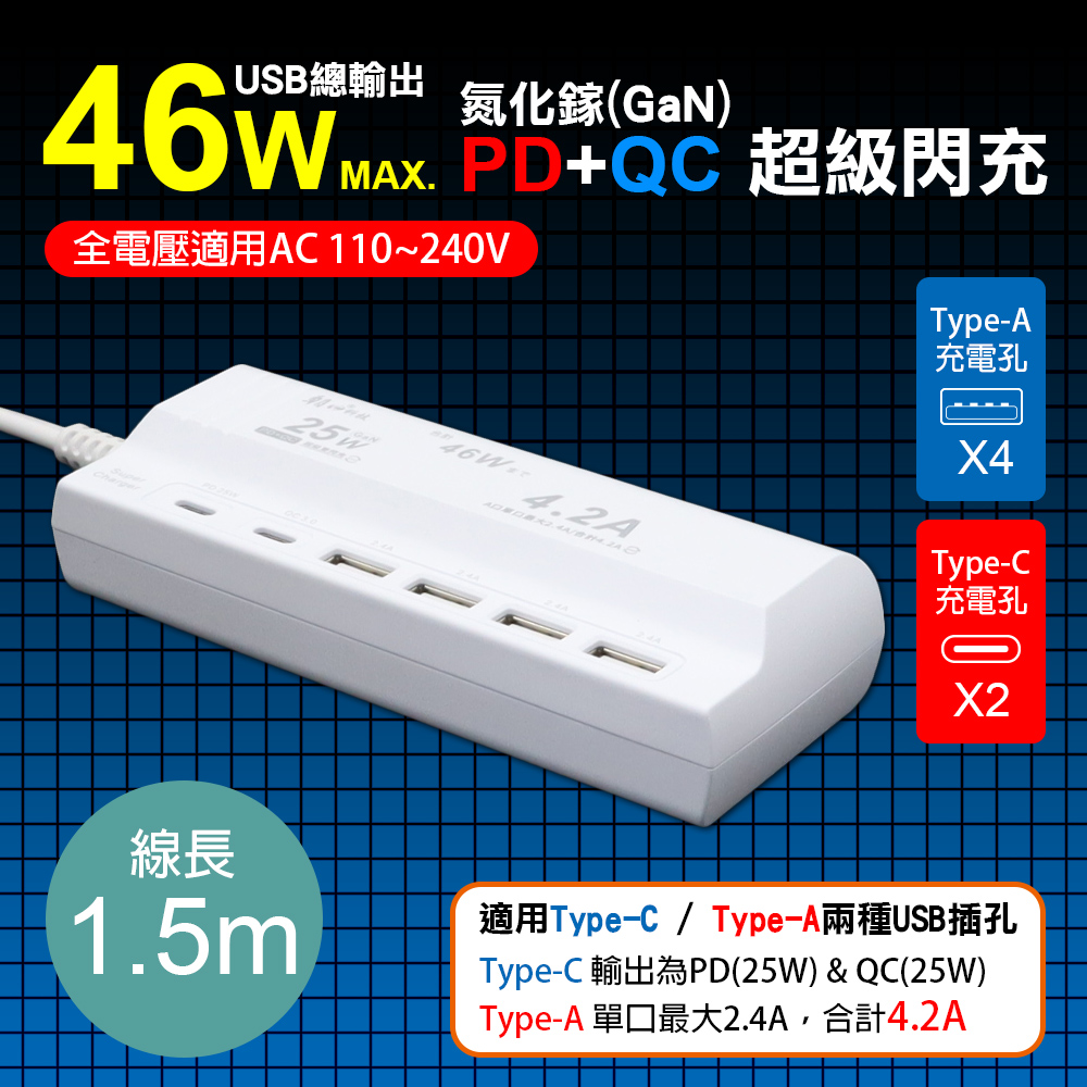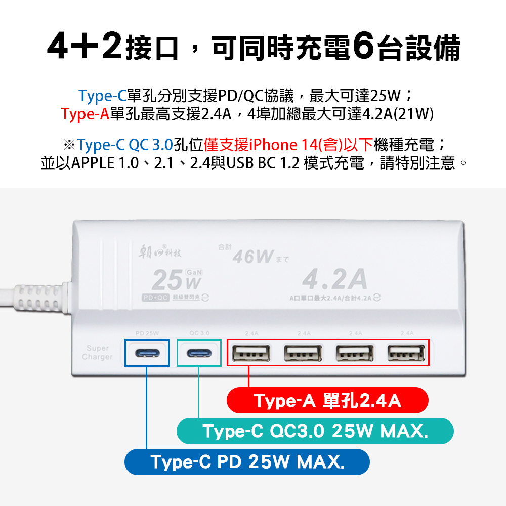●USB充電插孔*6口設計,Type C*2口+Type A*4口