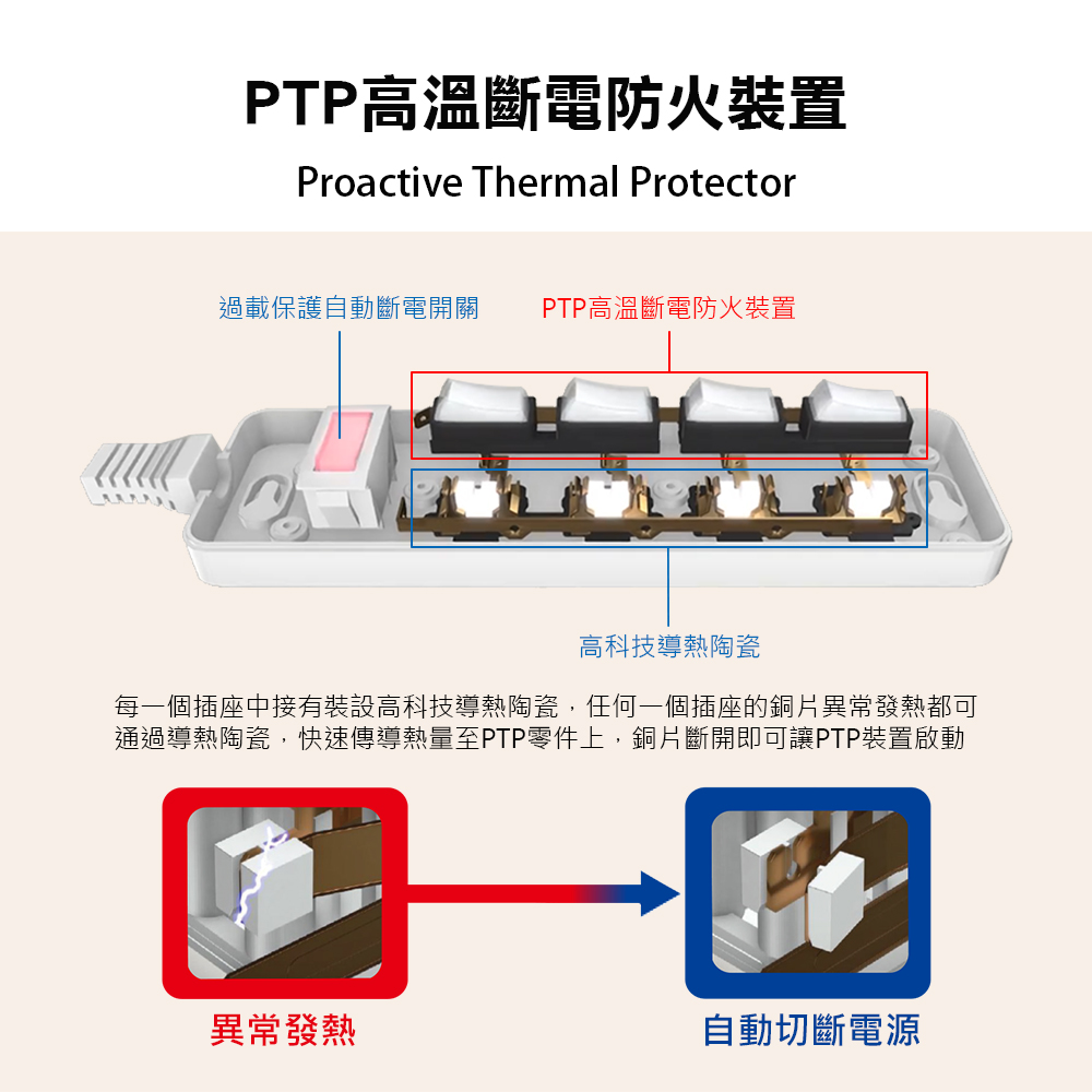 1.當PTP高溫斷電裝置啟動後,開關即無法自然定位在"ON"的位置,此時請勿強加外力通電,以免造成不預期且嚴重的危險。