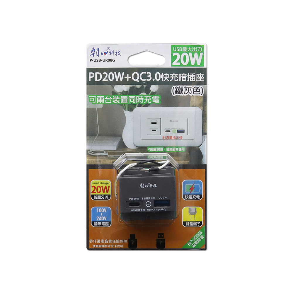 (P-USB-UR08G)PD 20W+QC 3.0快充暗插座(鐵灰色)